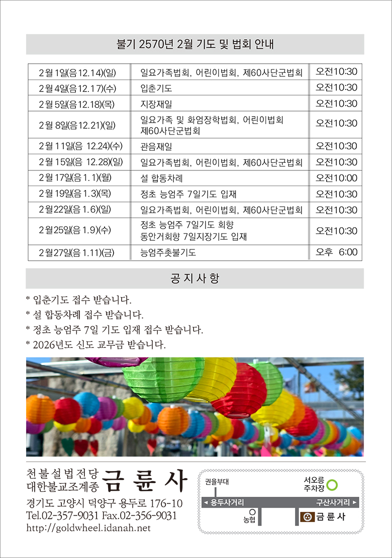 대한불교조계종 고양 금륜사경기 고양시 덕양구 용두로 176-10 (우. 10548)TEL. 02-357-9031